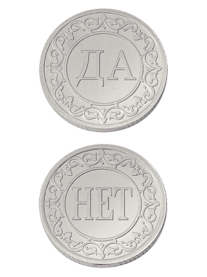 На одной стороне монеты изображена надпись "ДА", а на другой — "НЕТ". Такой аксессуар станет незаменимым помощником в моменты сомнений, когда нужно сделать выбор. Просто подбросьте монетку вверх, и пусть удача решит всё за вас!
