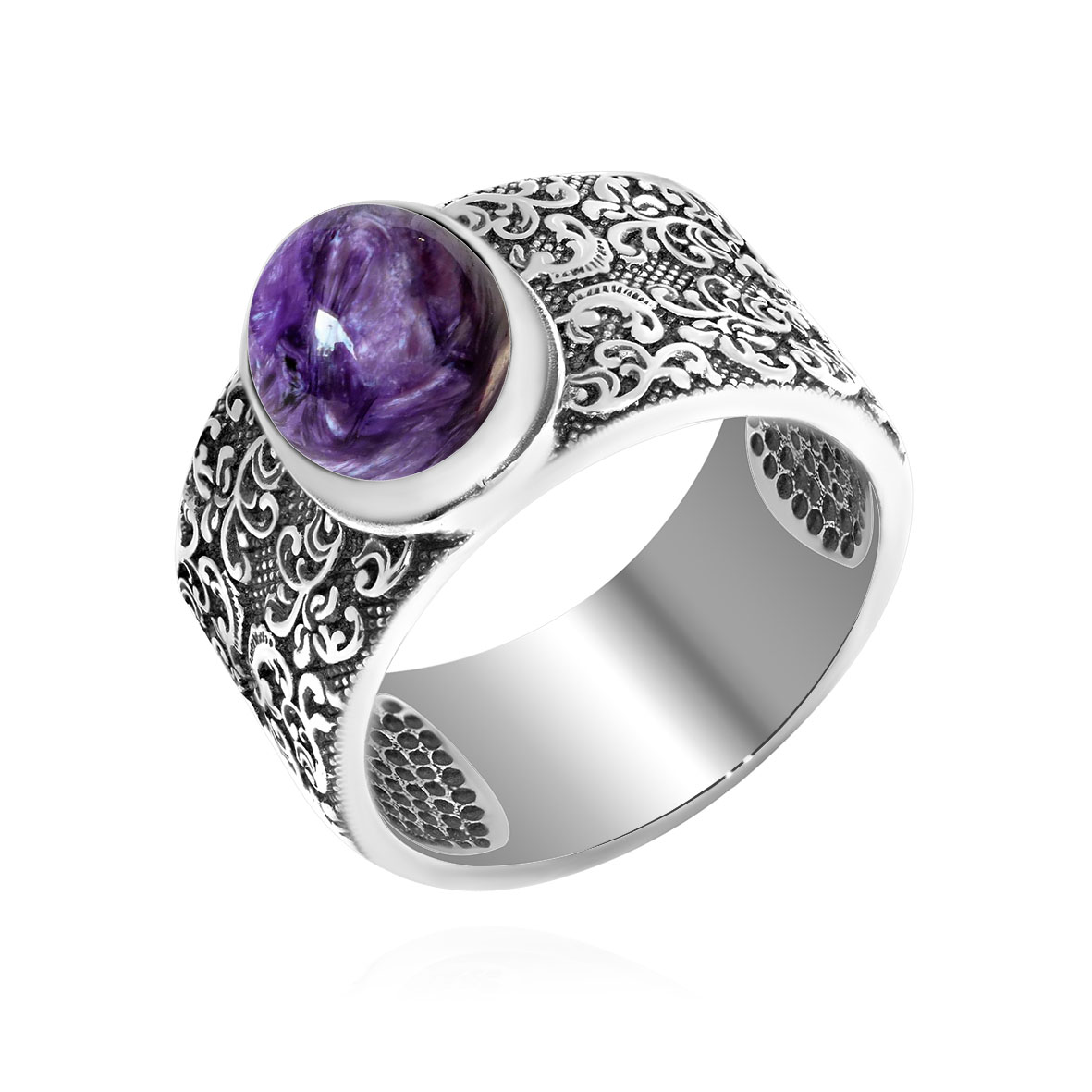 Серебряное кольцо с чароитом из коллеции "Boyarynia"эффектно смотрится на руке и притягивает внимание окружающих. Кольцо в минималистичном дизайне можно не снимать на протяжении всего дня. Непритязательная классика будет гармонировать со всеми фасонами вашей одежды. Серебряные кольца удобно креативно сочетать друг с другом и с фаланговыми кольцами. В коллекцию ювелирного бренда KRASNOE входят колье-чокеры и галстуки, дорожки, пусеты, джекеты, серьги-трансформеры, а также яркая детская коллекция с эмалью. Размер камня чароит натуральный овал 8*10мм. Ширина кольца 1см.