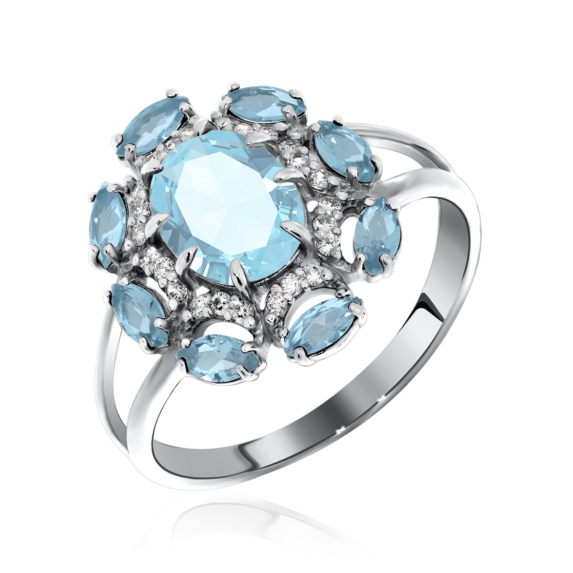 Кольцо серебро 925 пробы, прокрытие родий, с голубыми фианитами в кармезиновой закрепке, отличный дизайн для прекрасных дам .