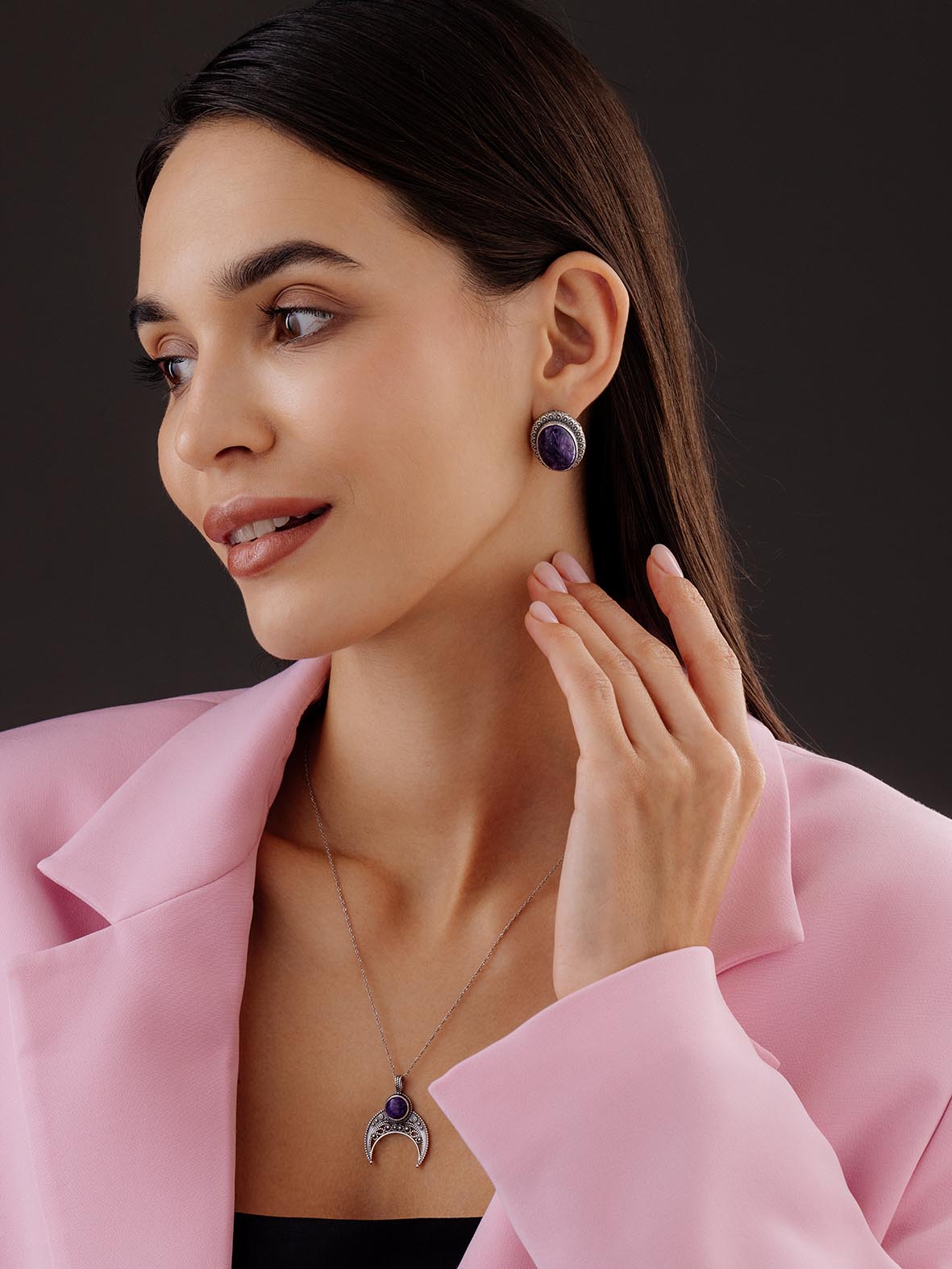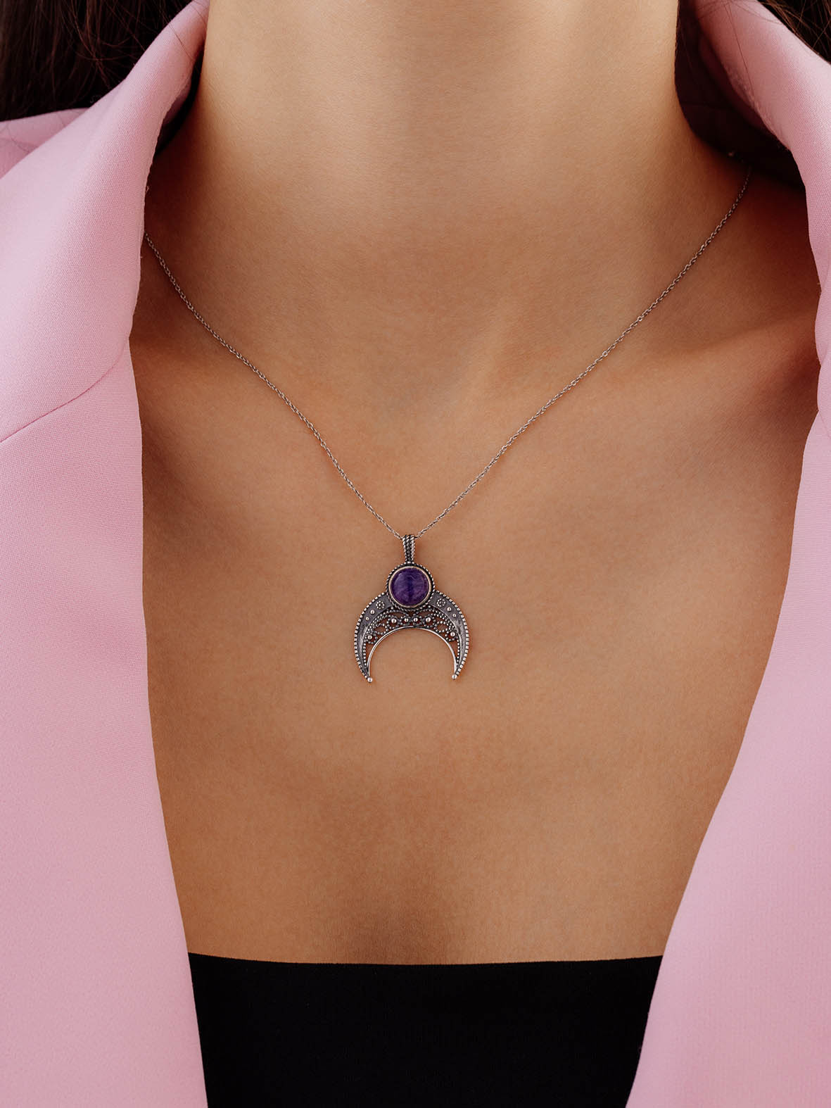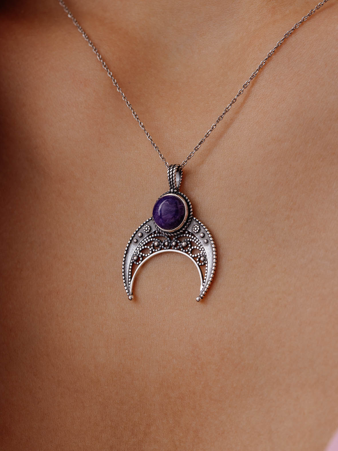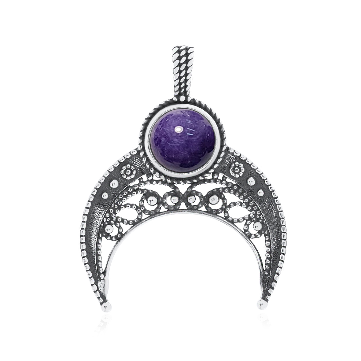 Подвеска лунница из серебра 925 пробы с чароитом натуральным от KRASNOE. Серебряный оберег "Лунница". Чароит — символ бескорыстия. В камне заключена чарующая прелестная сила