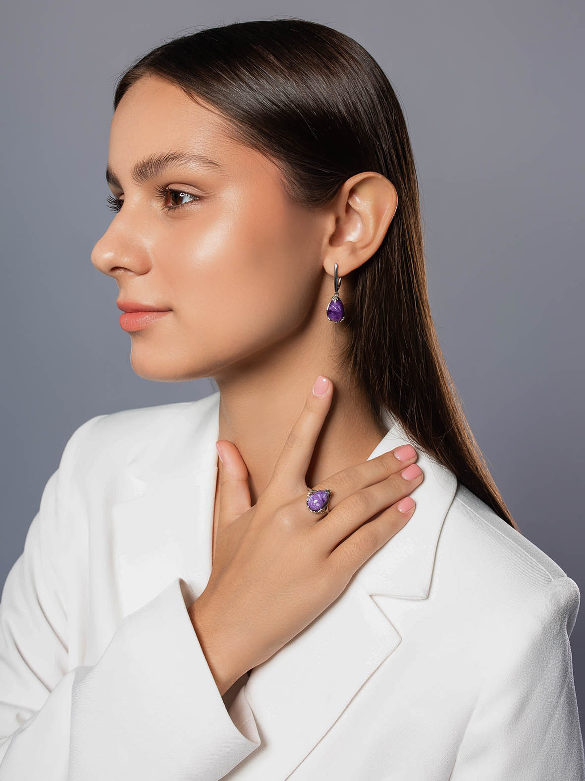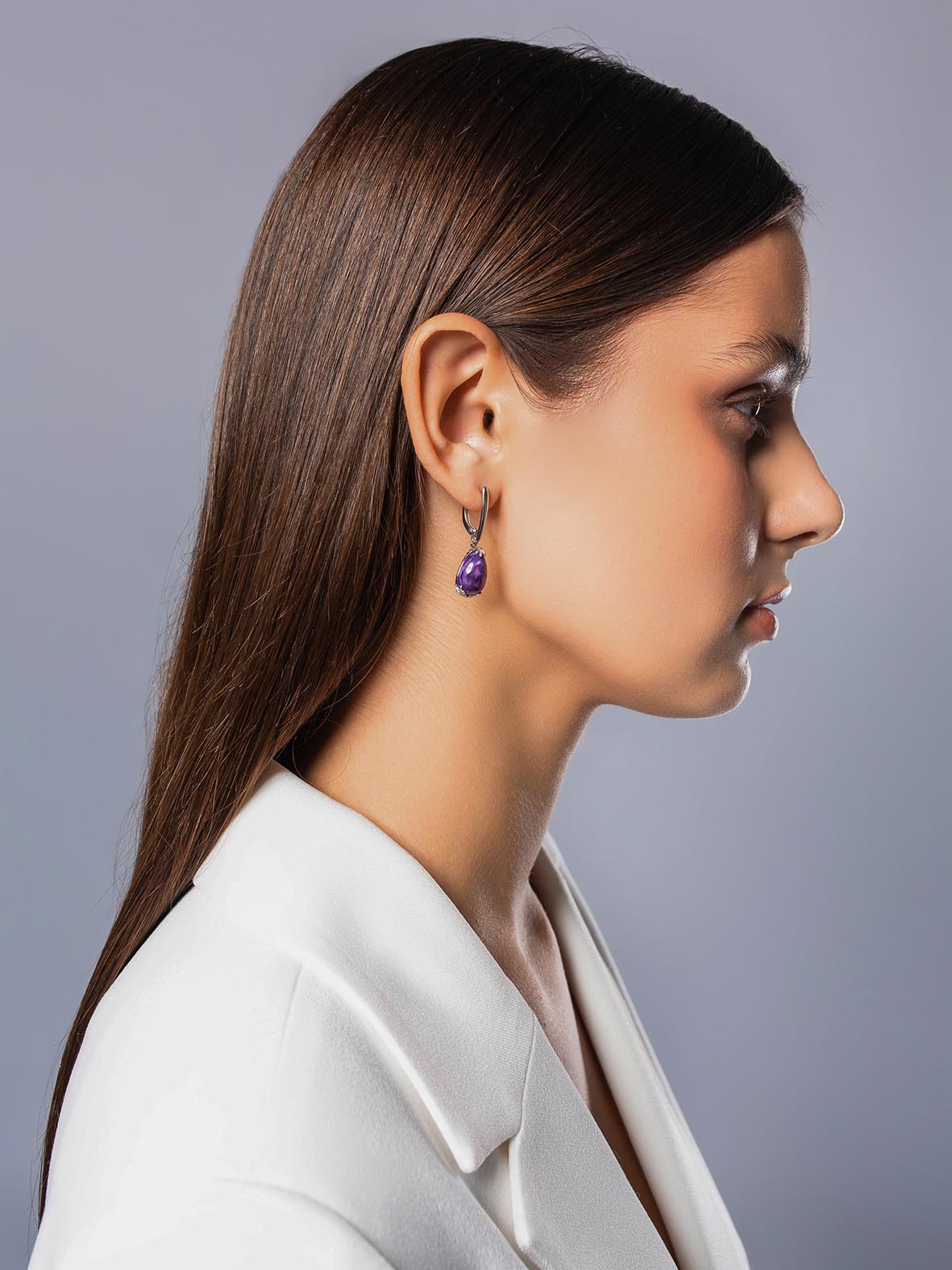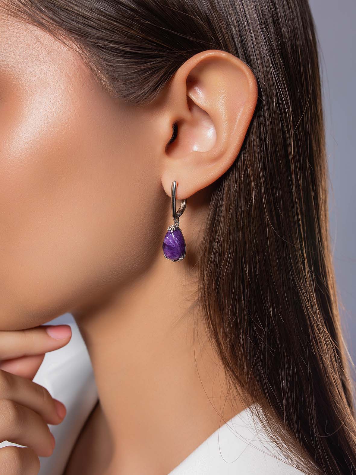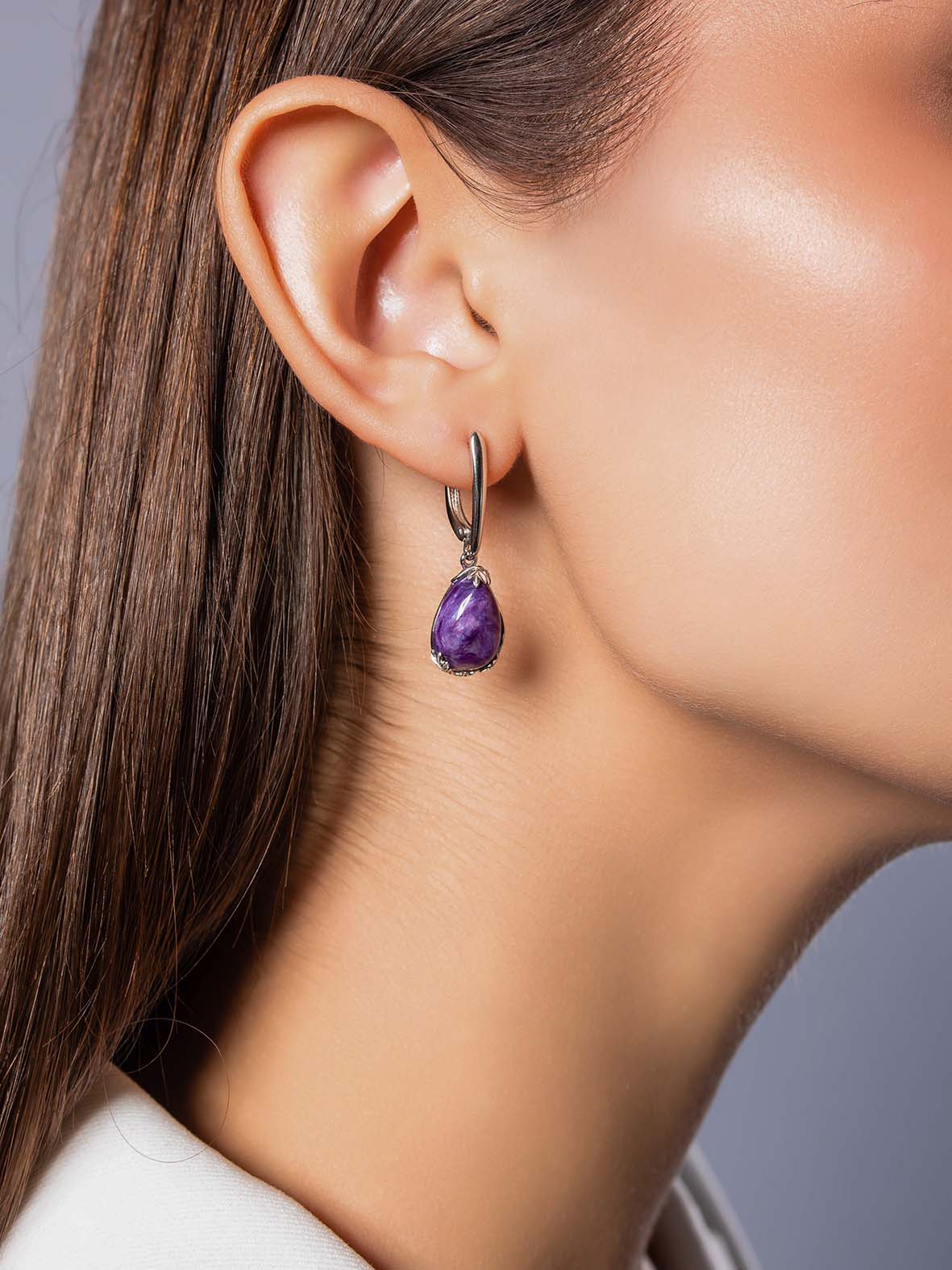Серьги для женщин из серебра 925 пробы с фианитами,чароитами из коллекции Уральские самоцветы артикул 2340465052л от компании KRASNOE