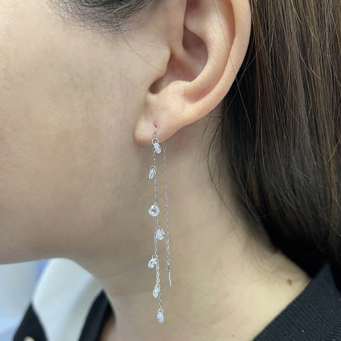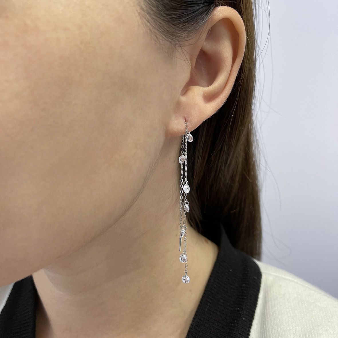 Серьги протяжки из серебра с подвесными элементами выполнены из серебра 925 пробы и бесцветных фианитов. Серьги протяжки дополнят любой образ за счет их адаптивности к любым сочетаниям. Благодаря легкой форме они станут актуальным вариантом для составления сетов с каффами. Преимущество этой модели в том, что акцент не столько на мочке уха, сколько на естественном изгибе шеи. Все длинные серьги-продевки идеально сбалансированы и не выпадают при ношении. KRASNOE - нежные и трендовые украшения из серебра 925 собственной разработки, дизайна и производства для красоты твоих будней! В коллекцию ювелирного бренда KRASNOE, кольца на фалангу, колье-чокеры и галстуки, джекеты, серьги-обманки , серьги-трансформеры, а также детские изделия из серебра. Размер вставки фианит бесцветный 4мм.