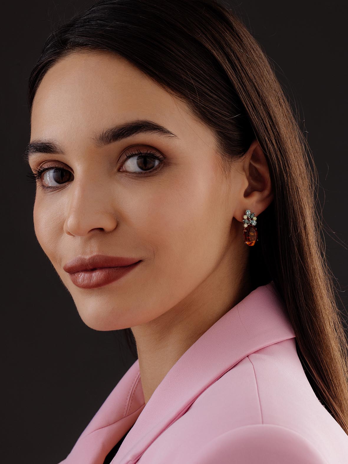 Для любителей натуральных камней и цветов мы создали коллекцию ювелирных украшений "Уральские самоцветы". Сочетания минералов, цепляющие дизайны и сила природы лежат в каждой частичке изделий. Завораживающая красота солннечного янтаря и россыпь мелких камней создают яркий ювелирный тандем. Такое украшение будет идеально сочетаться с натуральными тканями и естественным макияжем. Насладитесь частичкой природы! KRASNOE - нежные и трендовые украшения из серебра 925 собственной разработки, дизайна и производства для красоты твоих будней! В коллекцию ювелирного бренда KRASNOE входят пусеты, колье-чокеры и галстуки, джекеты, серьги-трансформеры, а также яркие детская коллекция.Размер всиавки: Наноизумруд маркиз 2,5*5, нанохризолит круг 2,5, фианит груша 3*5, янтарь овал кабошон 10*14.Длинна серьги 2.5см Ширина серьги 1см.